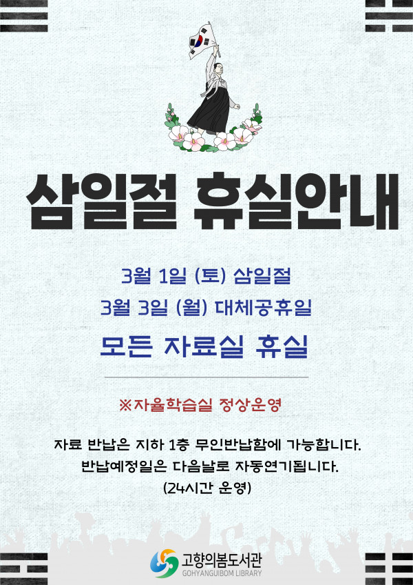 삼일절(3/1) 및 대체공휴일(3/3) 자료실 휴실 안내