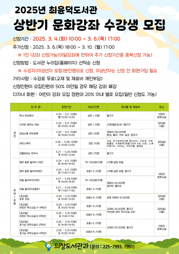 2025년 최윤덕도서관 상반기 문화강좌 수강생 모집