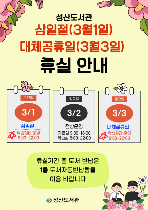 삼일절(3/1), 대체공휴일(3/3) 휴실 안내