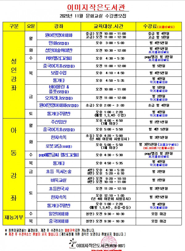 [마산회원구](이미지작은도서관) 11월 문화교실 수강생모집 안내