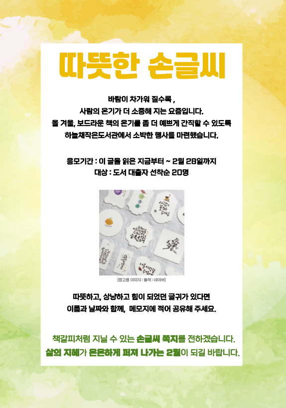 나에게 힘이 되고 따뜻했던 글귀가 있다면 남겨주세요. 책갈피처럼 지닐 수 있는 손글씨 쪽지를 만들어드려요. (선착순20명)