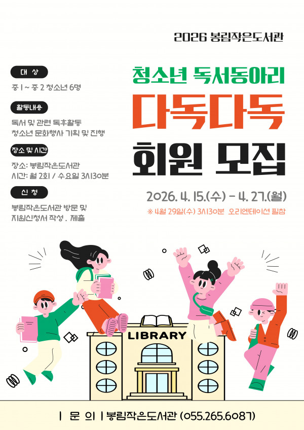 2026년도 청소년 독서동아리 다독다독의 회원을 모집합니다.