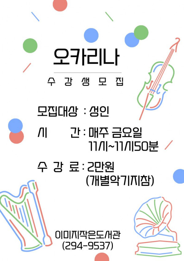 [마산회원구](이미지작은도서관) 오카리나 수강생모집 페이지 정보 작성자 김 * * 작성일25-09-18 17:54 조회84회 댓글0건 첨부파일 제목을 입력해주세요.jpg (82.4K) 0회 다운로드 DATE : 2025-10-02 17:25:37 관련링크 이전글 다음글 목록 본문 댓글목록 등록된 댓글이 없습니다. 이전글 다음글 목록