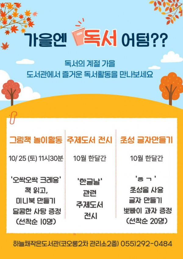[마산회원구](하늘채작은도서관) 10월 독서문화프로그램 페이지 정보 작성자 이 * * 작성일25-09-27 10:41 조회69회 댓글0건 첨부파일 10월 독서프로그램 홍보물.jpg (108.0K) 0회 다운로드 DATE : 2025-09-27 10:41:49 관련링크 이전글 다음글 목록 본문 독서의 계절 가을! 하늘채작은도서관과 함께 하실래요? 댓글목록 등록된 댓글이 없습니다. 이전글 다음글 목록