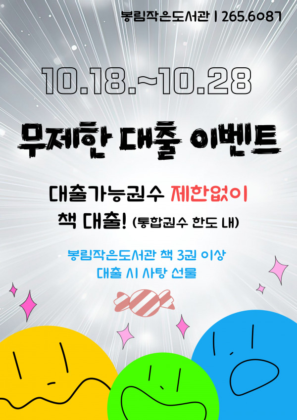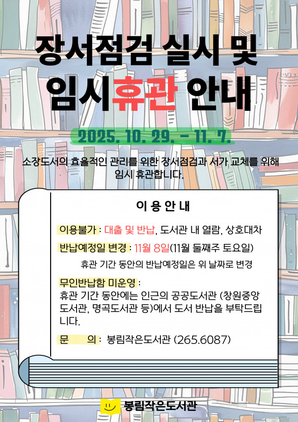 [의창구](봉림작은도서관) 장서점검 실시로 인한 휴관 안내 (10.29.~11.7.) 및 무제한 대출 이벤트